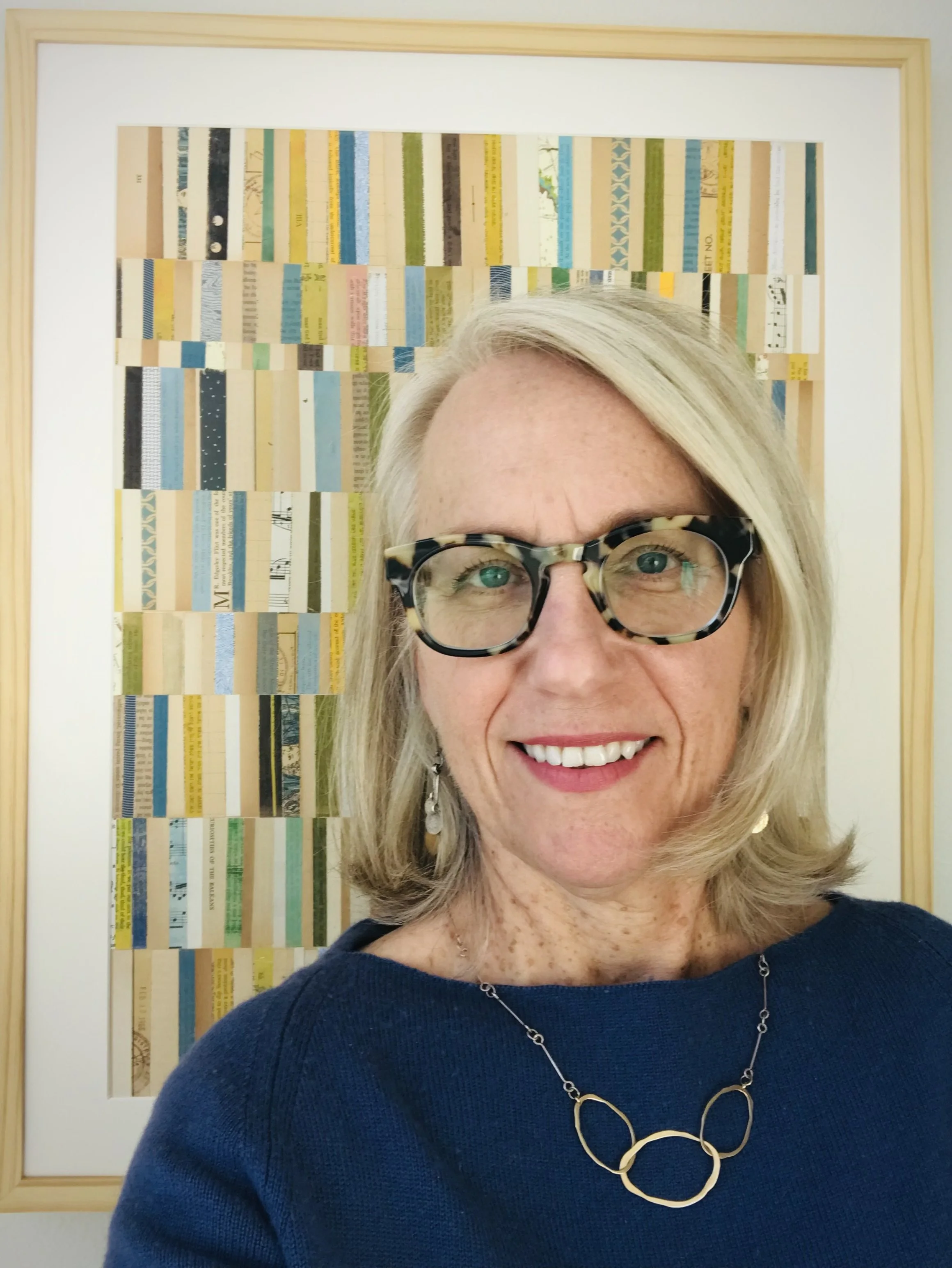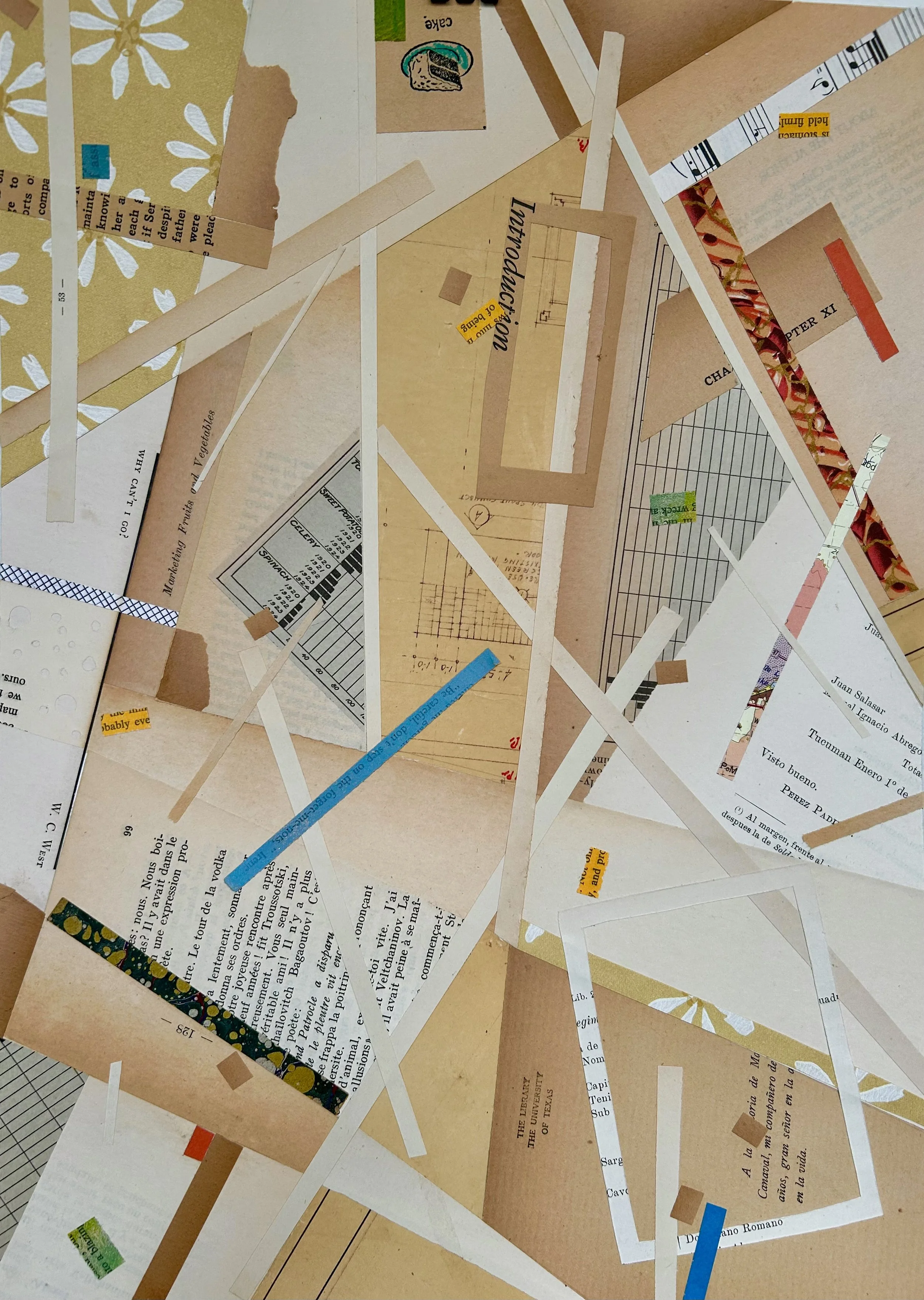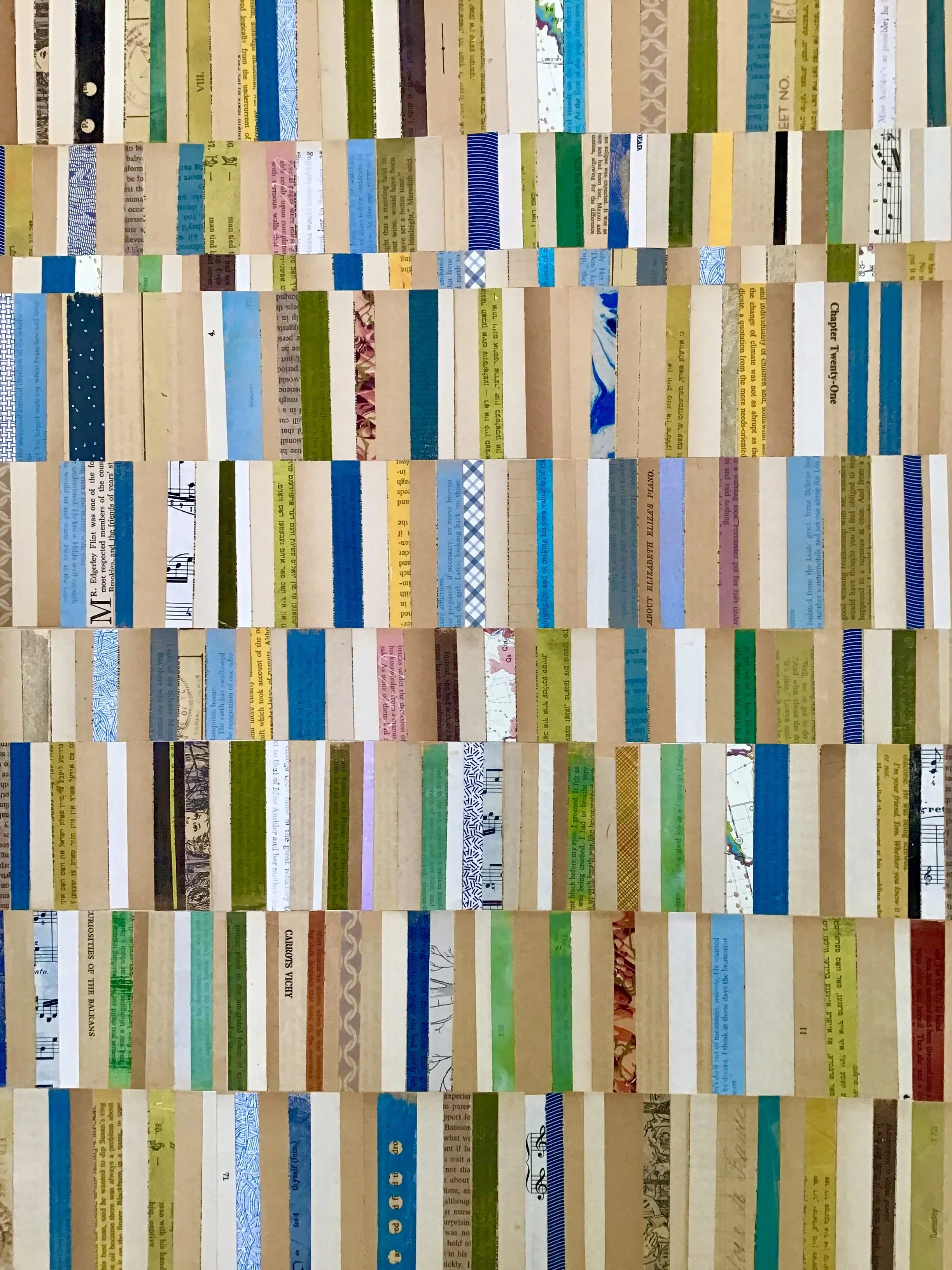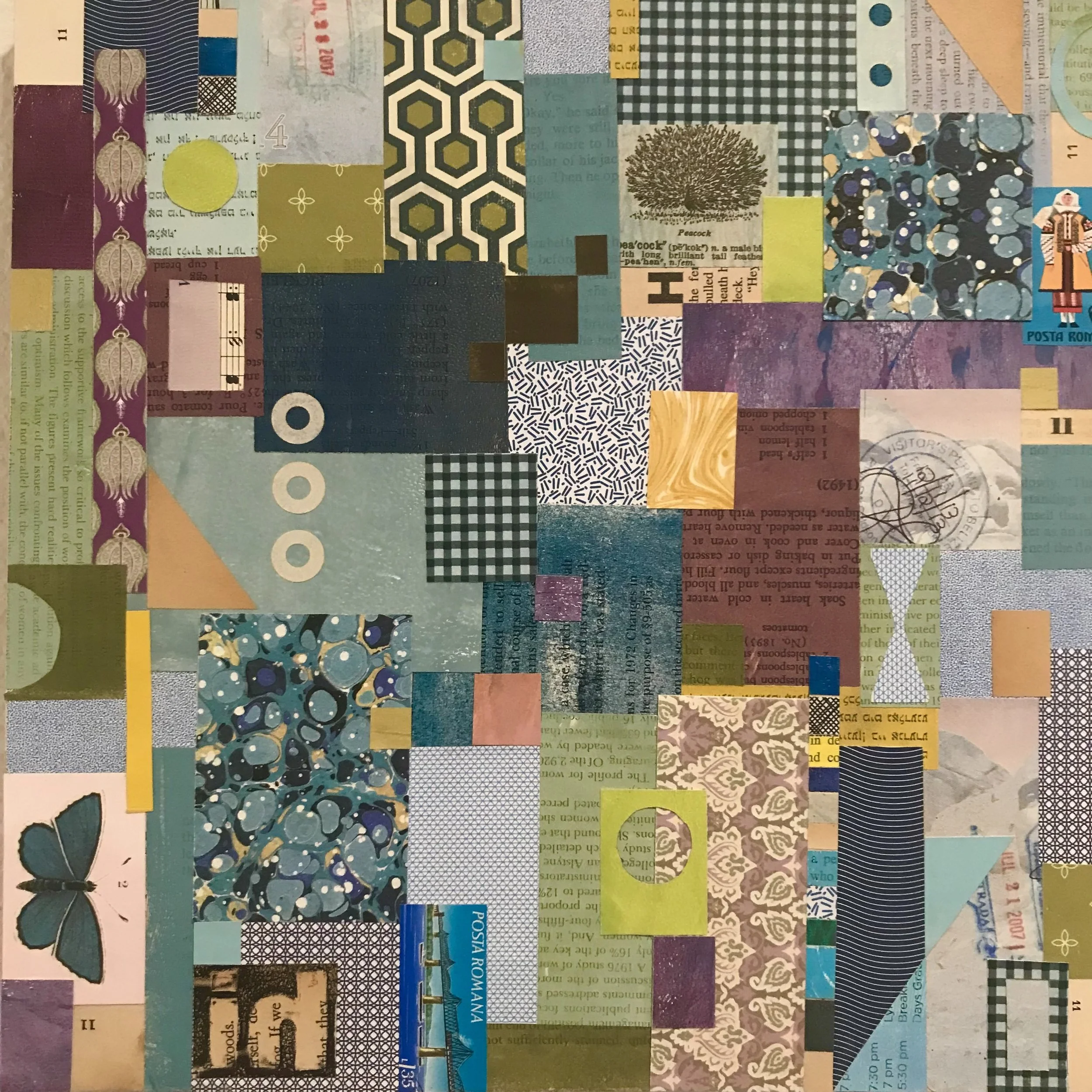 I am a collage artist interested in texture, pattern, color, history, and the tactile qualities of paper. I collect paper that has acquired patina over time and evokes nostalgia. My collages incorporate those memories, but blur the original meaning of the papers to create new stories. My source of materials include found papers, advertising, paperback romance novels, textbooks, vintage magazines, and product packaging. Incorporating my own personal ephemera like ticket stubs and event programs allows me to embed some of my own memories into the work or develop new narratives from someone else’s papers found in thrift stores, antique shops or even on the street.