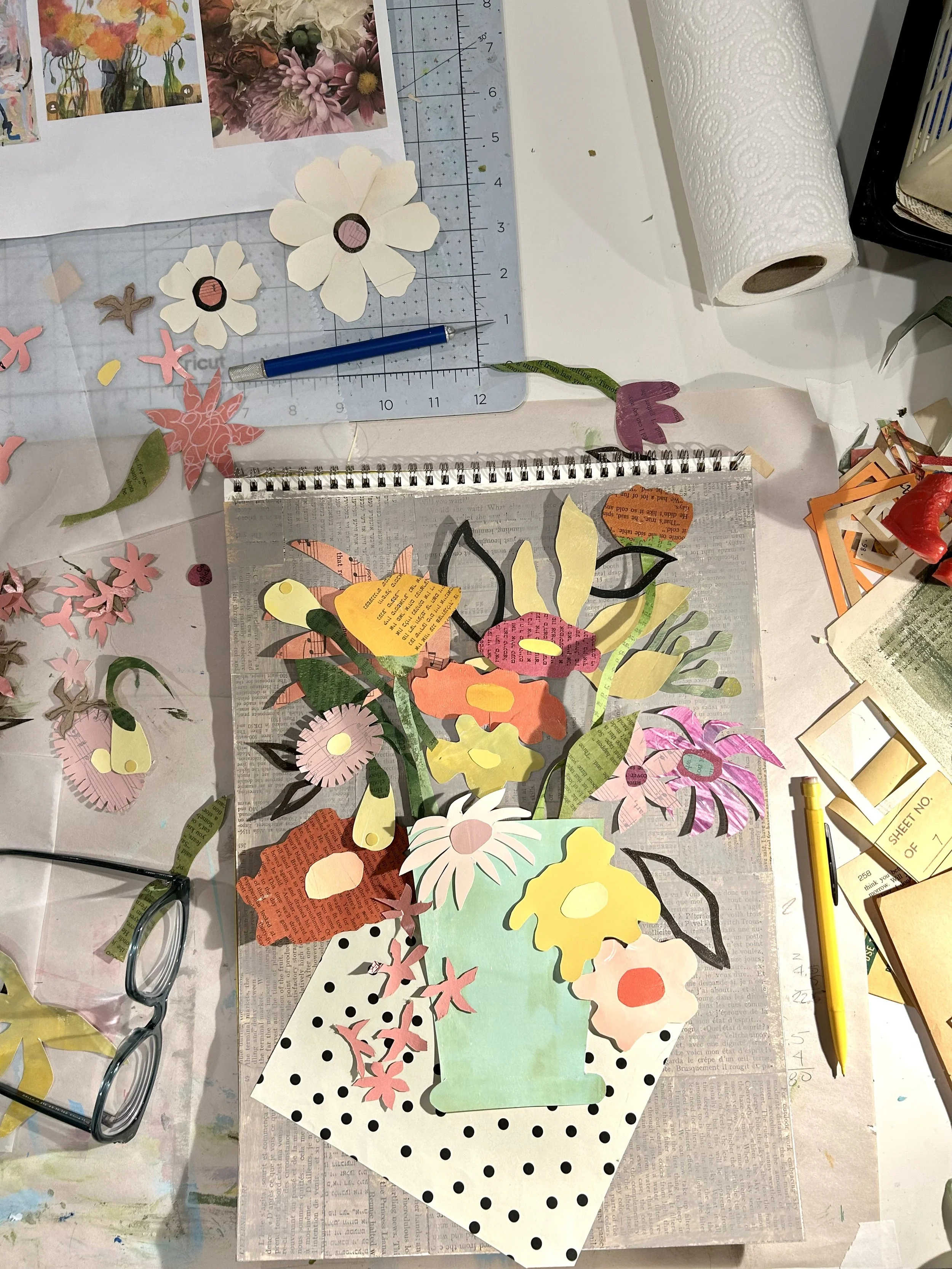 In this digital age, I’m very committed to paper! We all spend so much time looking at screens, texting on phones, meeting by Zoom. A hand cut collage is an antidote to all that tech, and a reminder of how we used to communicate and the lasting value of something committed to paper.