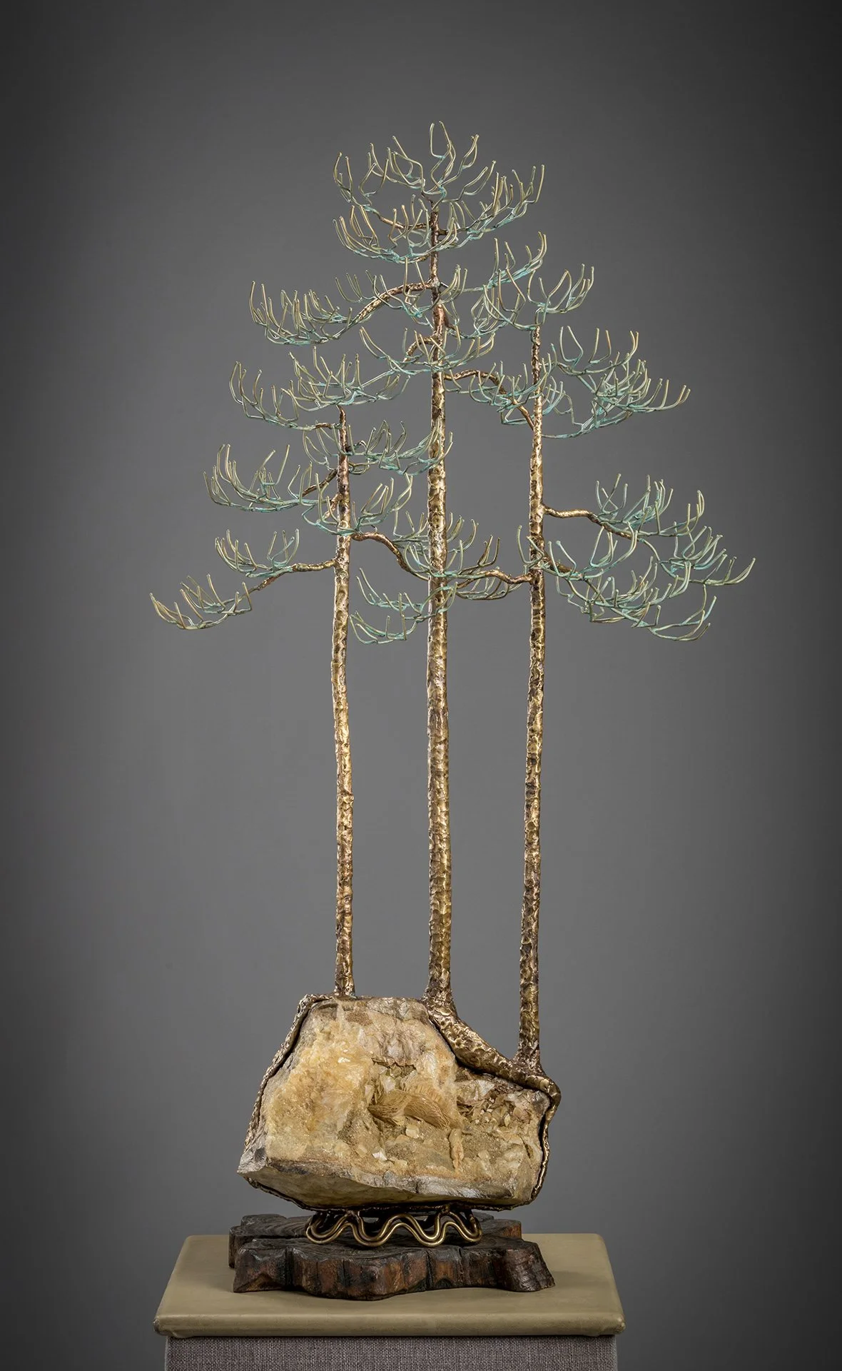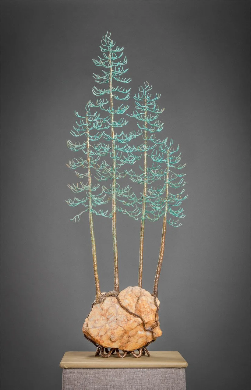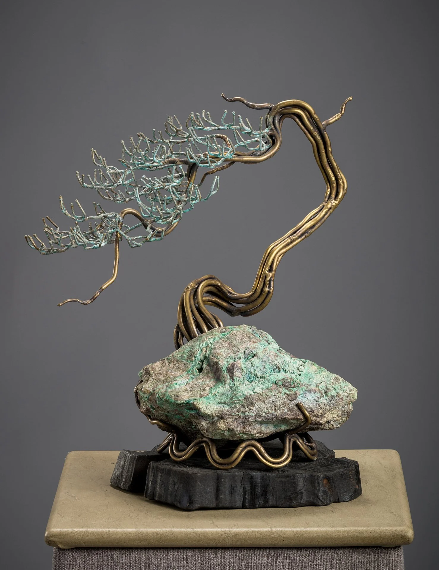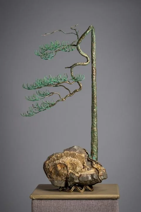Continuing my mother's legacy I use an oxyacetylene torch and bronze rods to create trees that mimic both bonsai trees, as well as those found in nature. I then mount them on stunning mineral specimens and/or an organic fine art pot. The process is very meditative ; the finished piece quite contemplative.